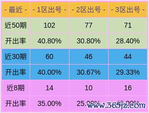近50期数据闪现:一区出号102个,二区出号77个,三区出号71个,1区号码出号占据多少上风。